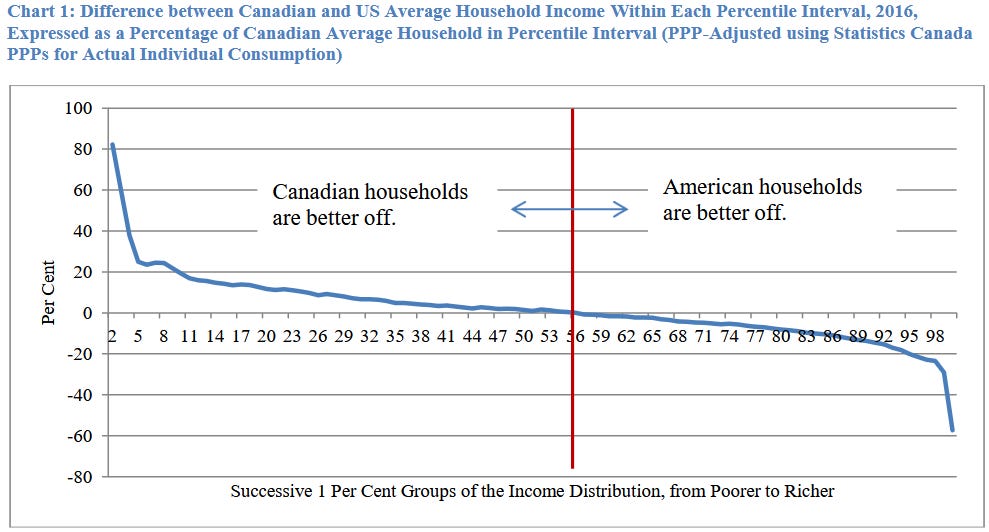 Another way to look at this is how income is distributed across the population. Lapointe sliced the population of each country into 100 equal parts, from the lowest income 1% to the highest income 1%, and averaged the income of each part. He found that “Canadian households in the bottom 56 per cent of the income distribution are in fact better off than American households at the same point of the income distribution”. And keep in mind that this analysis doesn’t take into account all the government services Canadians enjoy for less cost than Americans, likely making the financial situation for lower and middle-class Canadians even more favourable.